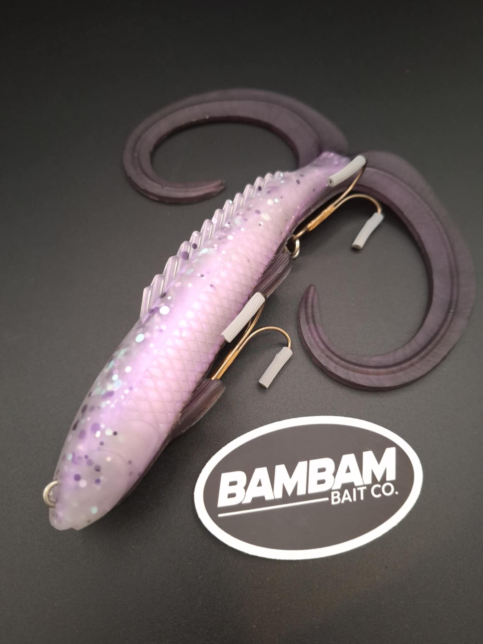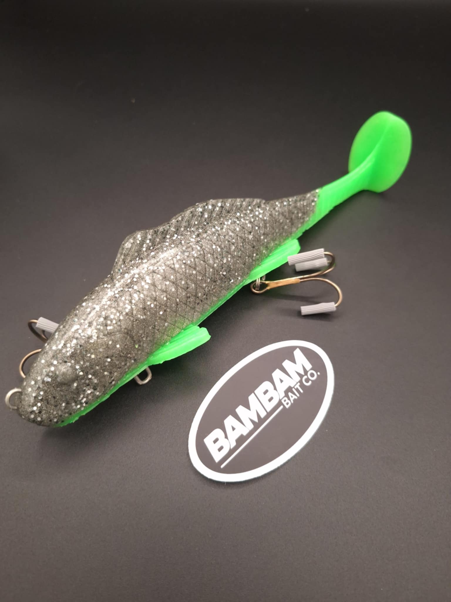 Shop SwimfinsThe Swimfin is a swimbait that is 9 inch long and 5oz. It catches fish on the straight retrieve and even better hopping it. It is weighted head forward and the tail never stops thumping!