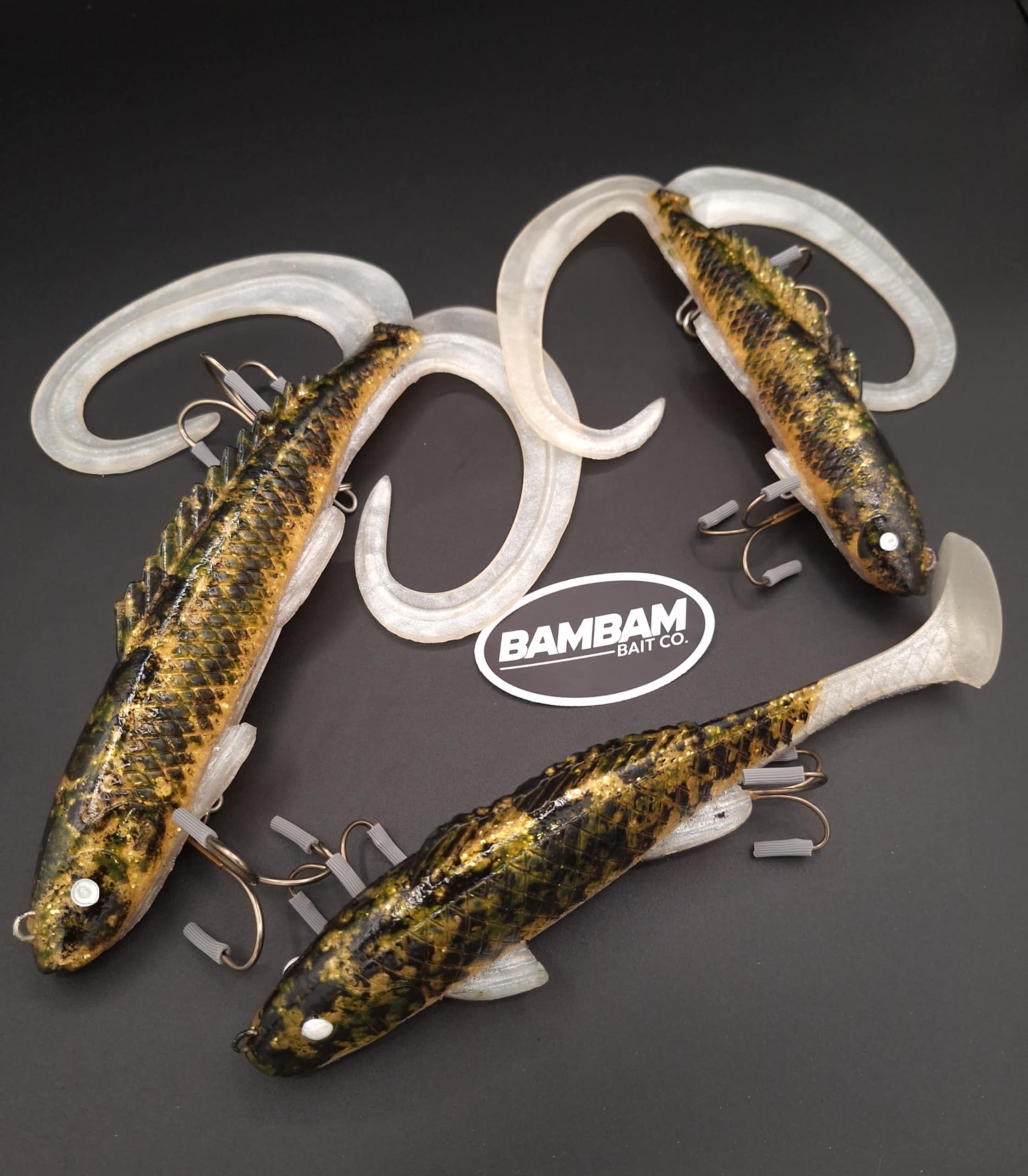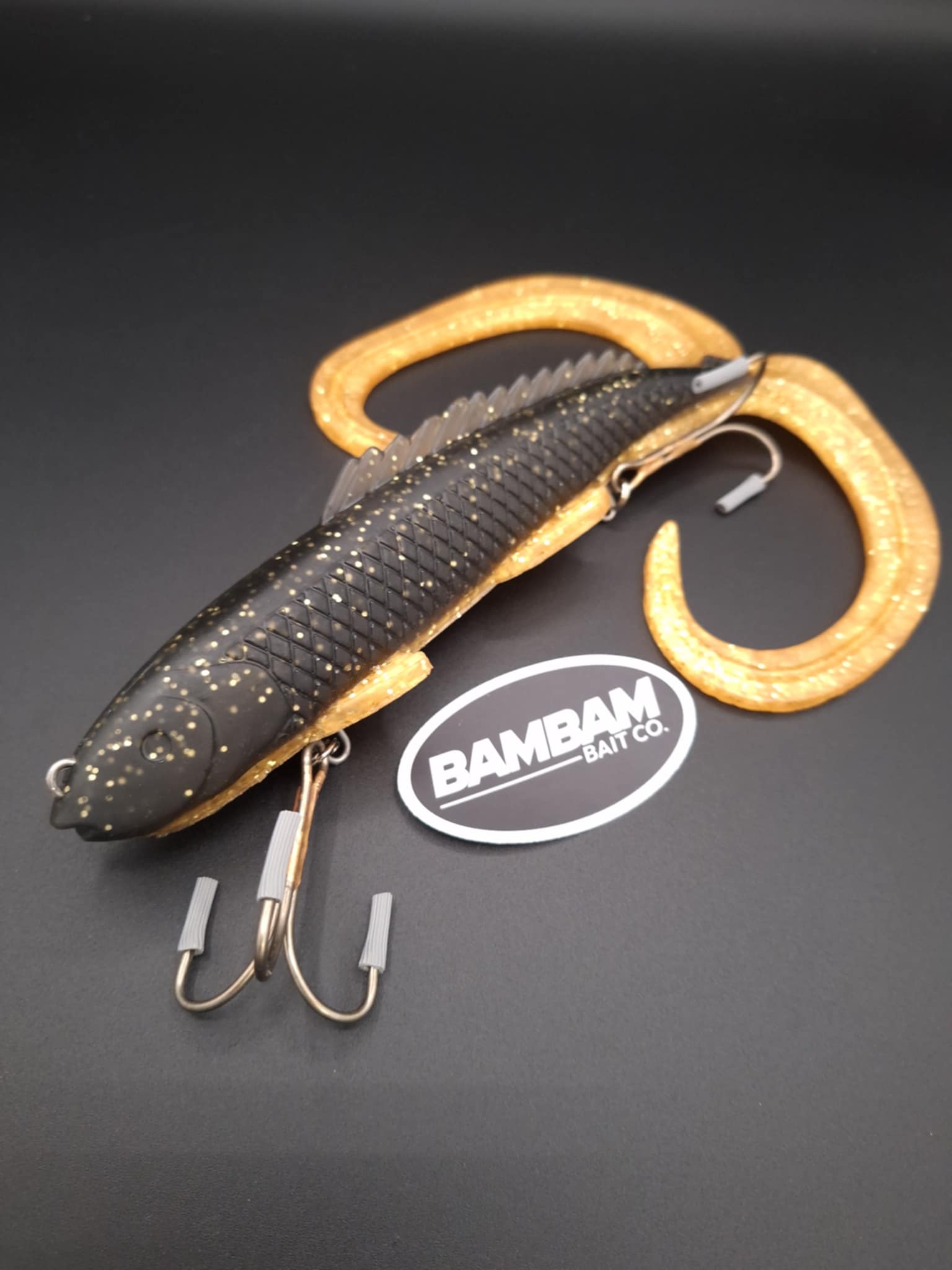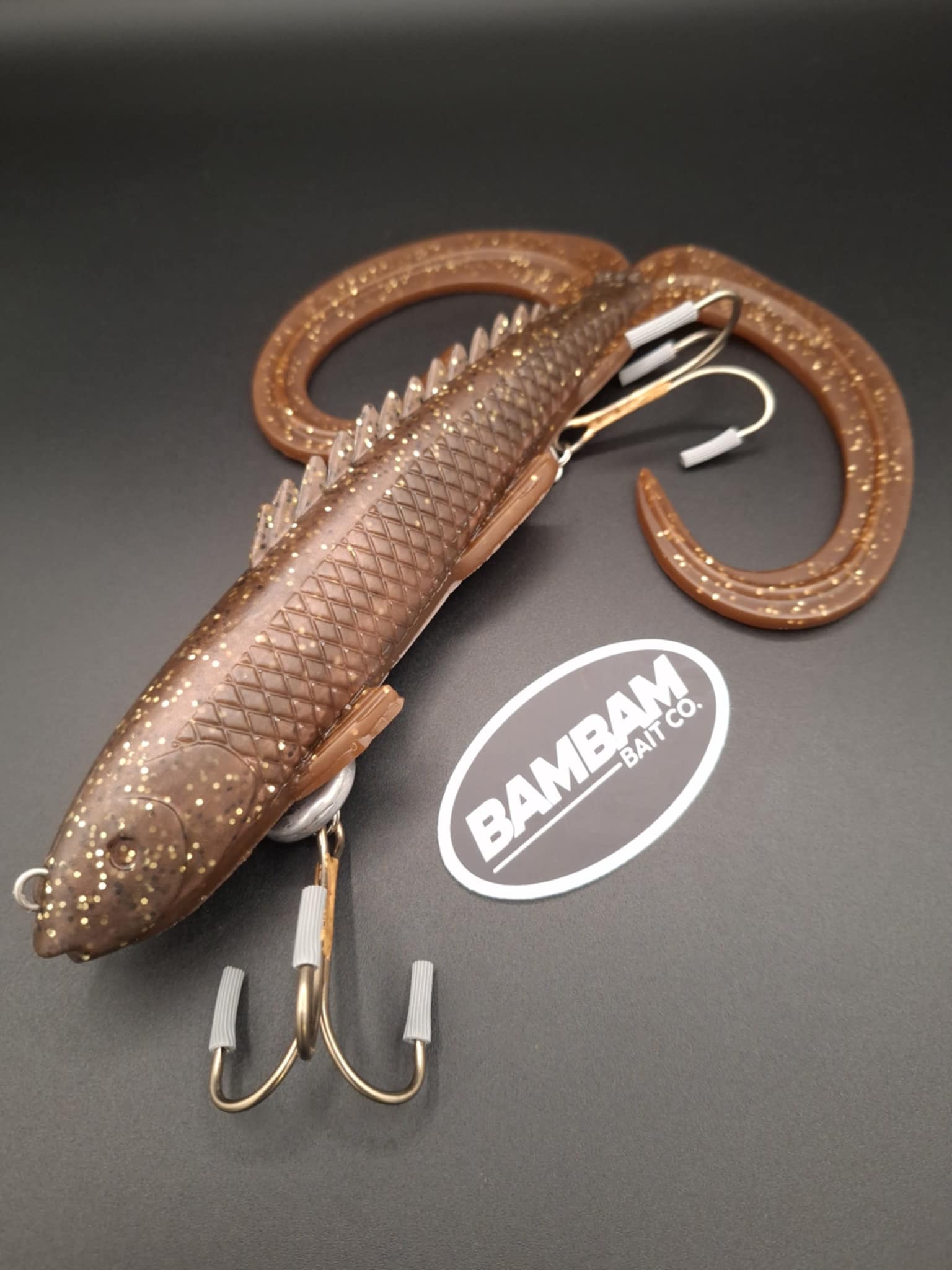 Shop Bowfin ShallowsThe Shallow Bowfin is roughly 18 inches long and weighs 7.5 oz. They are weighted forward for a head drop that triggers a bite! The shallows all have a hole punched at the rear of the bait so you know its a shallow. Can add belly weights to hit different depths or to work the bait faster.